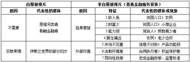 另一方面,有一部分群体是自愿被排斥的,他们并不是普惠金融的服务客体。一是极少数的、思想或精神极端者,他们会对金融体系和产品服务表现出较强的抵触情绪;二是被宗教思想约束的人,这部分人数相对较多。比如,在伊斯兰国家,妇女较少接受教育,一般不出席一些正式场合,也不去银行机构办理各种金融业务。同时,由于长期受宗教礼法侵染,当地的女性也“乐得其所”,在一定程度上,她们潜在的金融需求可以委托亲朋来间接实现。