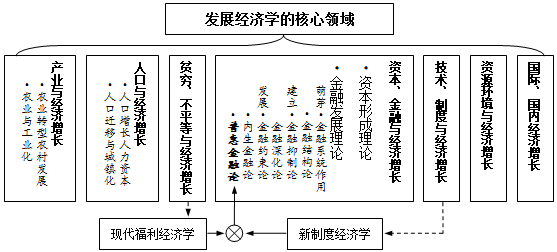普惠金融的实现过程,是由最初的金融排斥,发展到最终的金融包容乃至金融公平。它是发展经济学中金融发展理论的重要前沿。从更宏观的视角来看,发展经济学关注的核心领域有:产业结构及升级与经济增长的关系、人口增长及迁移与经济增长的关系、资本形成及金融发展与经济增长的关系等等(见图1)。其中,金融发展理论就是后者的一个核心组成部分。在战后初期,凯恩斯主义和结构主义占据学界主流思想,金融体系仅被视为实现赶超式发展的融资工具。在20世纪60年代,金融体系对经济增长的作用被重新界定,金融发展理论应运而生。至今,代表性的分支理论有:金融结构论、金融抑制/金融深化论、内生金融理论和金融约束论等,它们与普惠金融论都有着深层次的理论渊源。