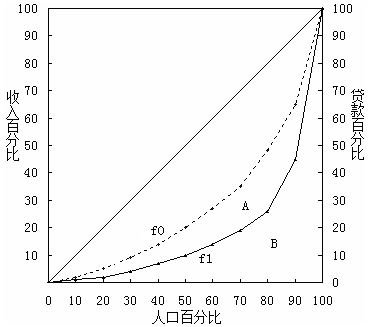 普惠金融公平系数的功能,即测度金融发展的公平程度。为了量化普惠金融公平系数,需要引入一个基本的假设条件:金融可行能力可以由个人(或企业)的收入水平或财富总量考量。即个人(或企业)的收入水平越高、财富总量越大,他理应获得更大额度的金融服务。当此成立时,在居民层面上(企业层面也可以按照类似的方法计算基准线),就可以将洛伦兹曲线做为测度金融发展公平程度的基准线;同时,可以遵照洛伦兹曲线的构建方法,按照每百分比人口得到的贷款占比来衡量,生成一国当前的金融服务分配曲线。